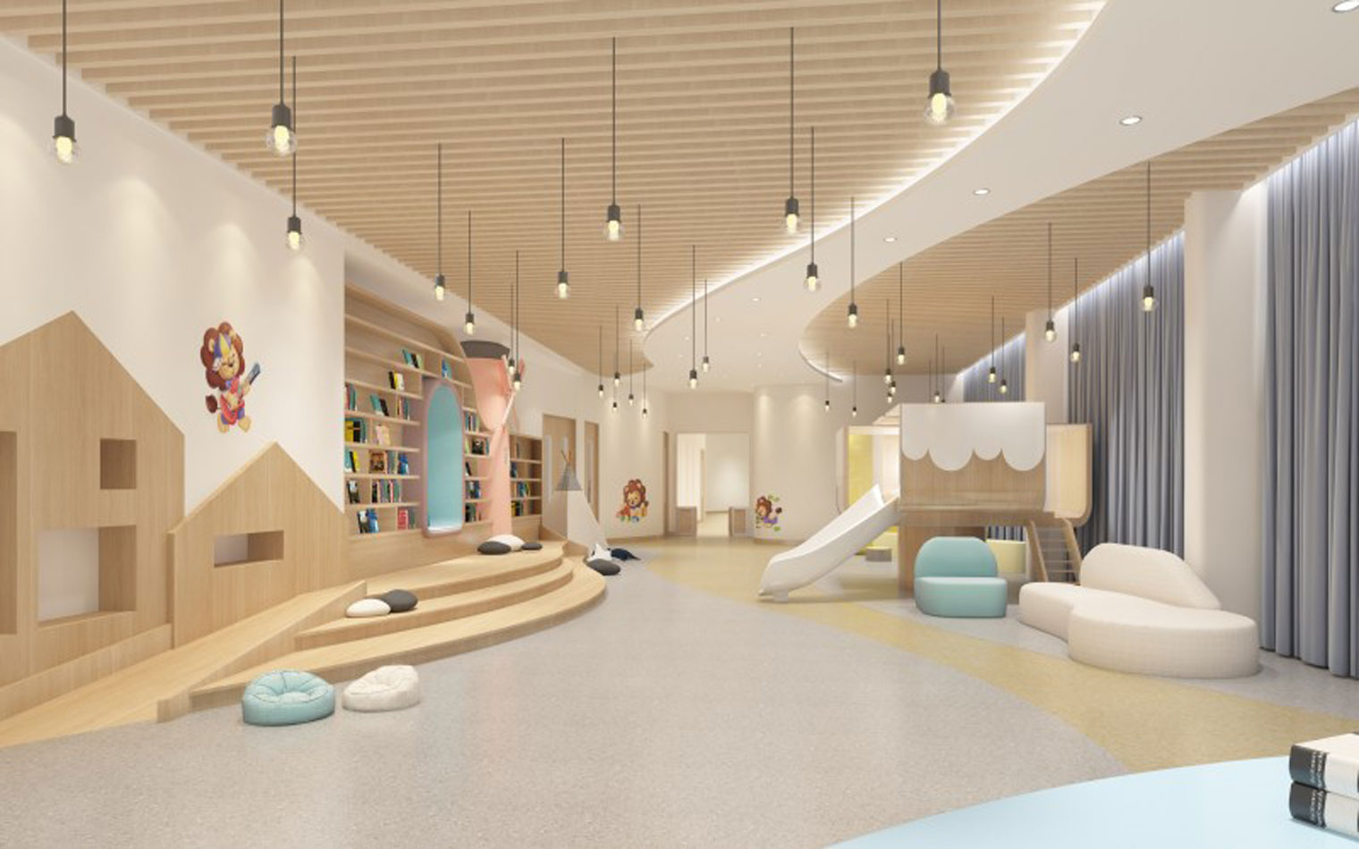 本案以中心案例作為旨在開發(fā)孩童的想象力和創(chuàng)造力的地方,其室內(nèi)裝修設(shè)計不同于傳統(tǒng)美術(shù)教育空間,熱情濃烈的色彩,像一把能夠開啟幼兒全方位潛能的鑰匙,幫助每個孩子創(chuàng)造出自己的獨特。