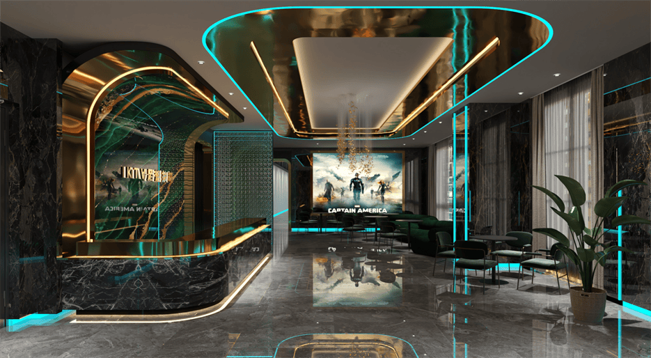 前臺(tái)區(qū)域,以黑色大理石搭配金色弧形裝飾,背景墻的綠色紋理石材與金色線條相得益彰,彰顯高端品質(zhì)。大廳中,大型影視屏幕與綠植點(diǎn)綴,營造舒適氛圍。