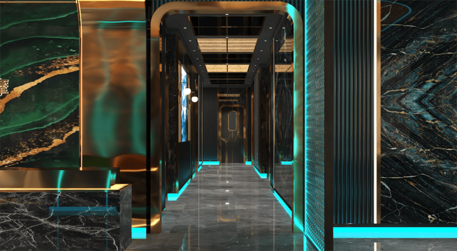 走廊及包間,深色大理石地面搭配藍(lán)色燈帶,營造出神秘且時(shí)尚的氛圍。包間內(nèi),木質(zhì)墻板搭配綠色石材背景墻,溫馨舒適,星空頂設(shè)計(jì)增添浪漫情調(diào)。KTV 包間,藍(lán)色霓虹燈帶與鏡面材質(zhì)結(jié)合,打造出炫酷的視聽空間,舒適的沙發(fā)座椅提升顧客體驗(yàn),整體設(shè)計(jì)旨在為顧客提供一個(gè)集休閑、娛樂、放松于一體的高品質(zhì)場(chǎng)所。