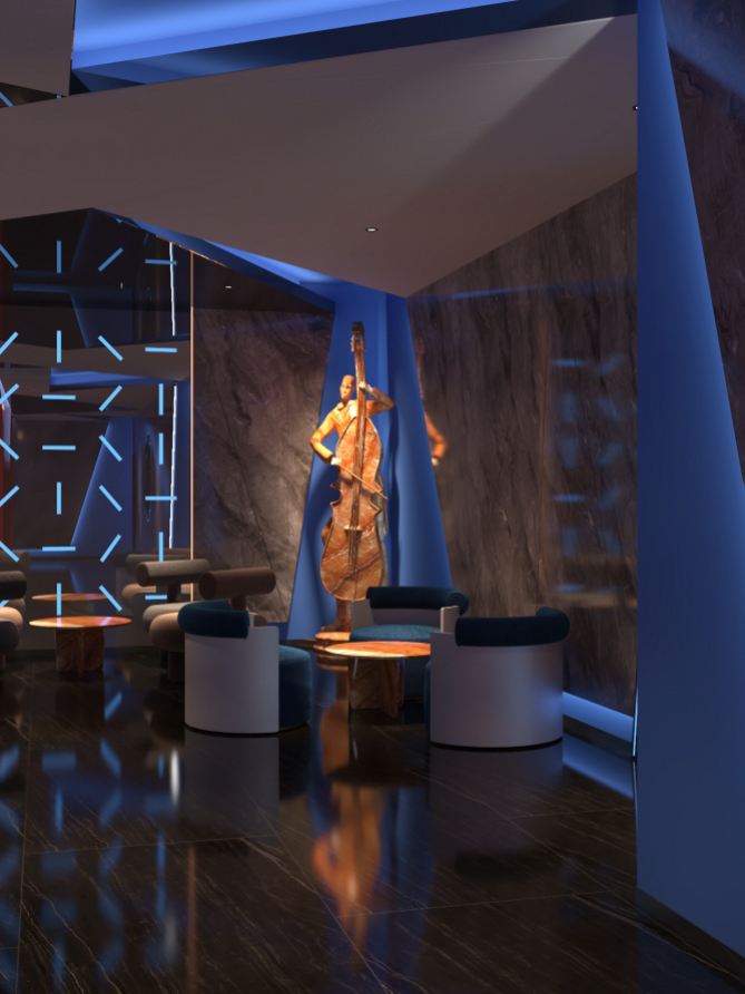 休息區(qū),墻面大型顯示屏播放動(dòng)感畫面,搭配舒適的藍(lán)色沙發(fā)與藝術(shù)雕塑,營(yíng)造出輕松愉悅的氛圍。走廊區(qū)域,深色大理石墻面結(jié)合藍(lán)色燈光線條,天花板的幾何造型燈帶與地面反射效果相呼應(yīng),增強(qiáng)空間的縱深感與科技感,墻壁上的藝術(shù)畫作和裝飾增添了文化韻味,整體設(shè)計(jì)旨在為顧客打造一個(gè)舒適、時(shí)尚且充滿活力的休閑娛樂(lè)空間。