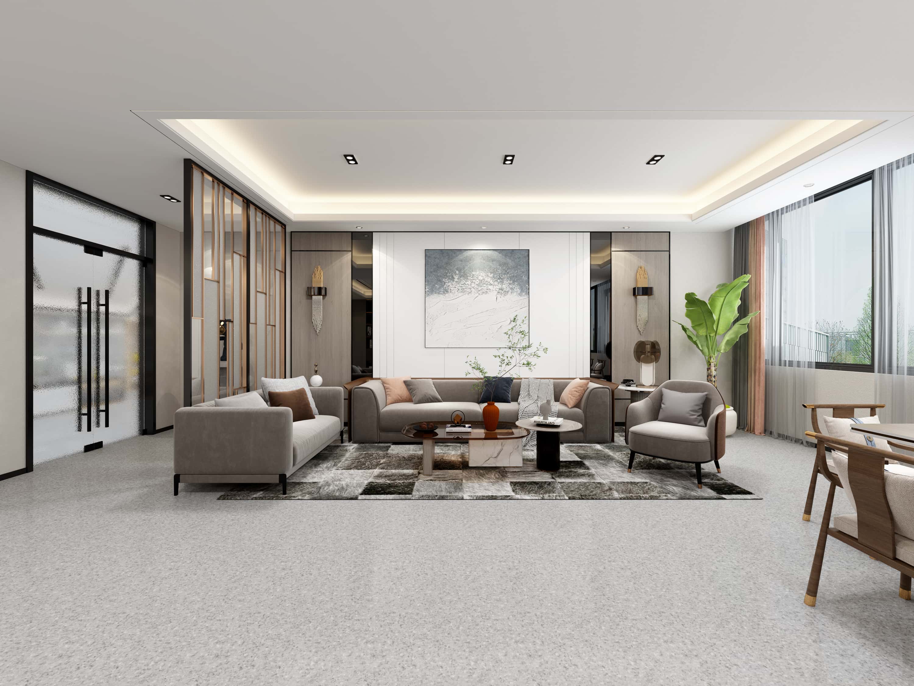 接待室,淺灰地毯搭配柔和燈光,營造舒適氛圍,沙發(fā)、茶幾等家具擺放錯落有致,藝術(shù)畫作提升空間格調(diào)。