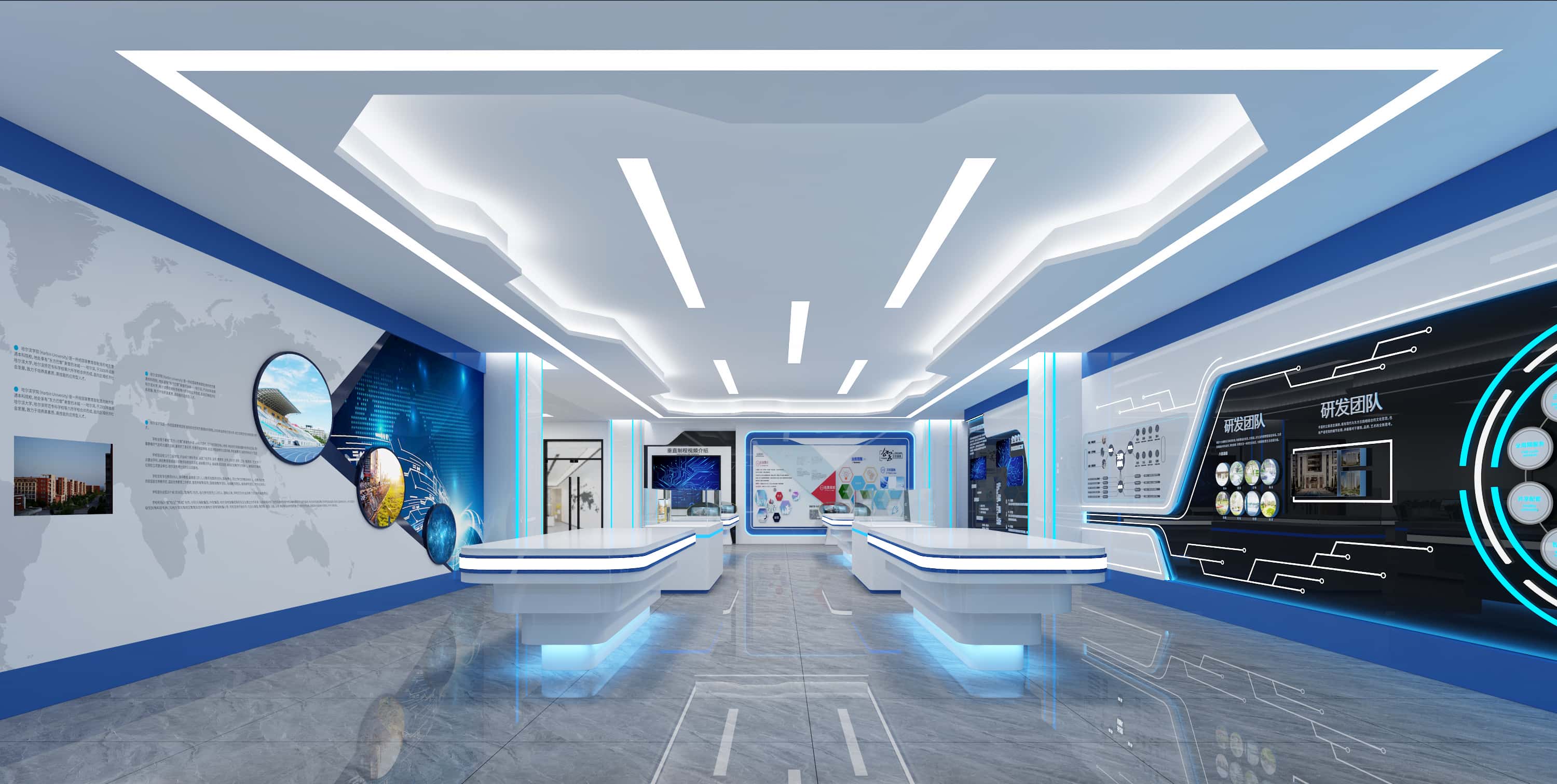 展廳區(qū)域,藍(lán)白配色凸顯科技感,墻面展板結(jié)合多媒體設(shè)備,全面展示企業(yè)信息,展示臺造型獨(dú)特,燈光設(shè)計增強(qiáng)空間立體感,打造出一個充滿科技與未來感的展示空間。