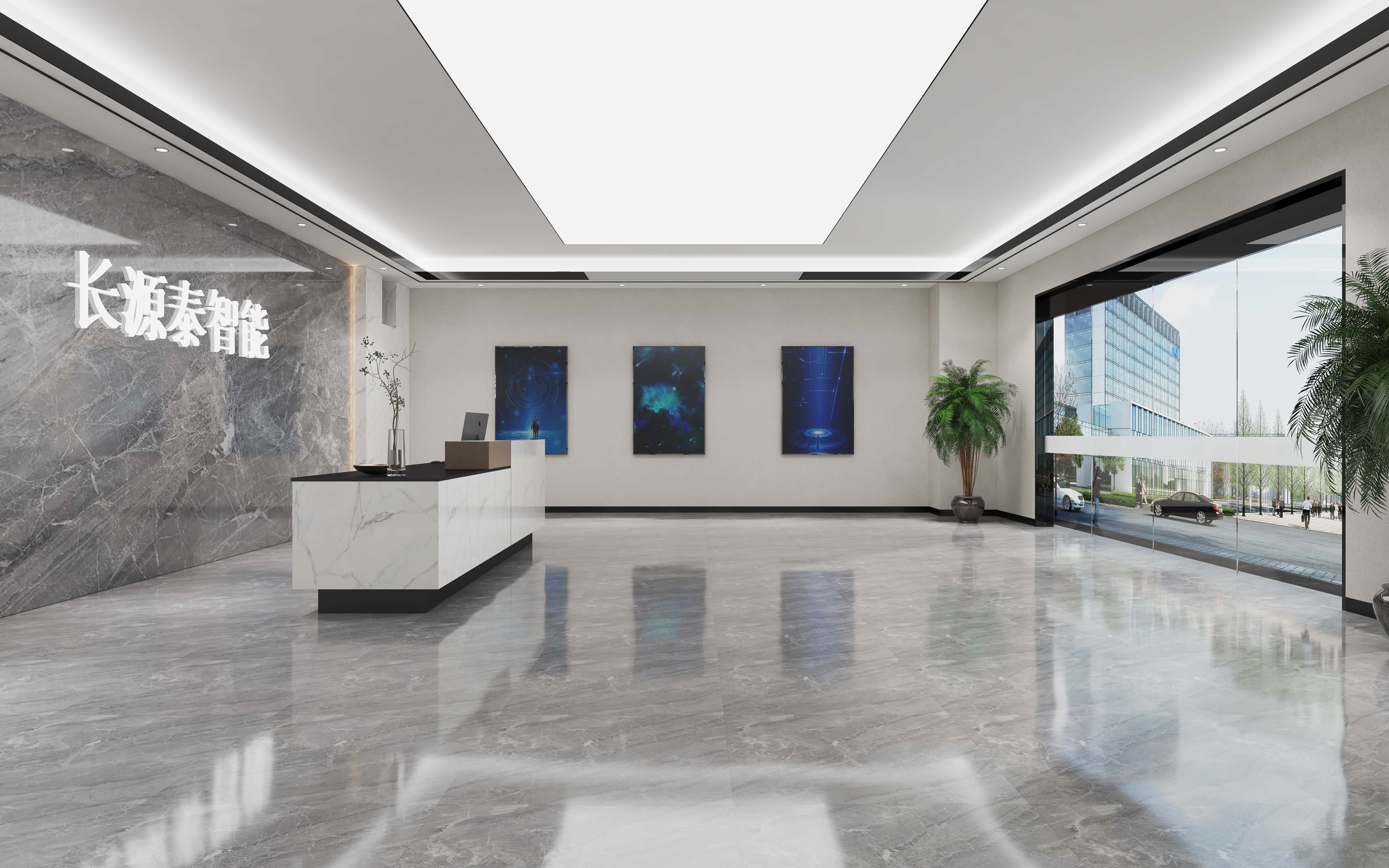 前臺(tái)區(qū)域,以大理石搭配簡(jiǎn)潔的前臺(tái)設(shè)計(jì),背景墻的公司名稱醒目,兩側(cè)的藍(lán)色科技感畫(huà)作與綠植增添生機(jī)與現(xiàn)代氛圍。