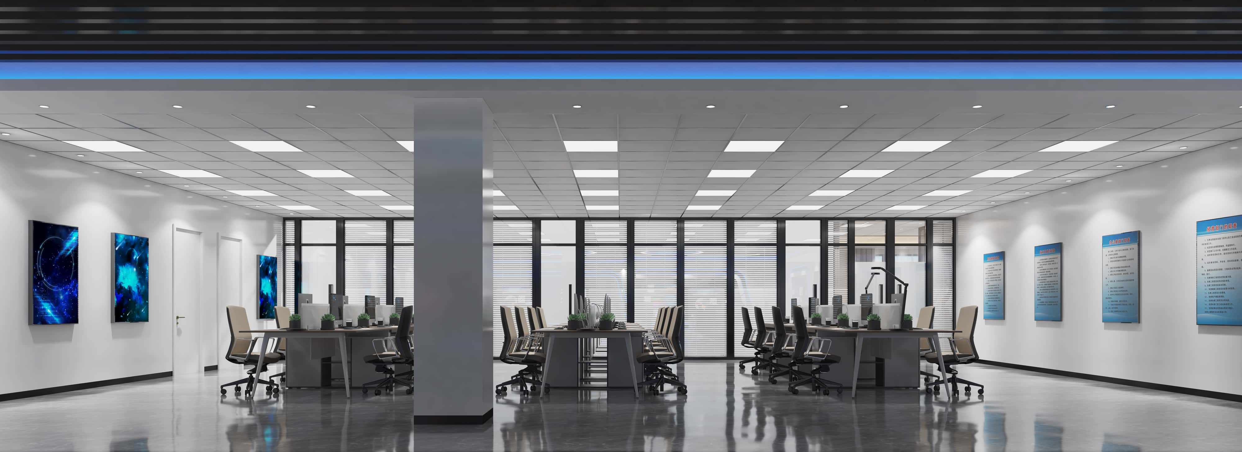 辦公區(qū),空間寬敞明亮,白色墻面與灰色地面搭配協(xié)調(diào),大面積窗戶引入自然光,搭配百葉窗可調(diào)節(jié)光線,墻上的科技主題畫(huà)作與規(guī)章制度展板相得益彰,營(yíng)造出專業(yè)高效的工作環(huán)境。