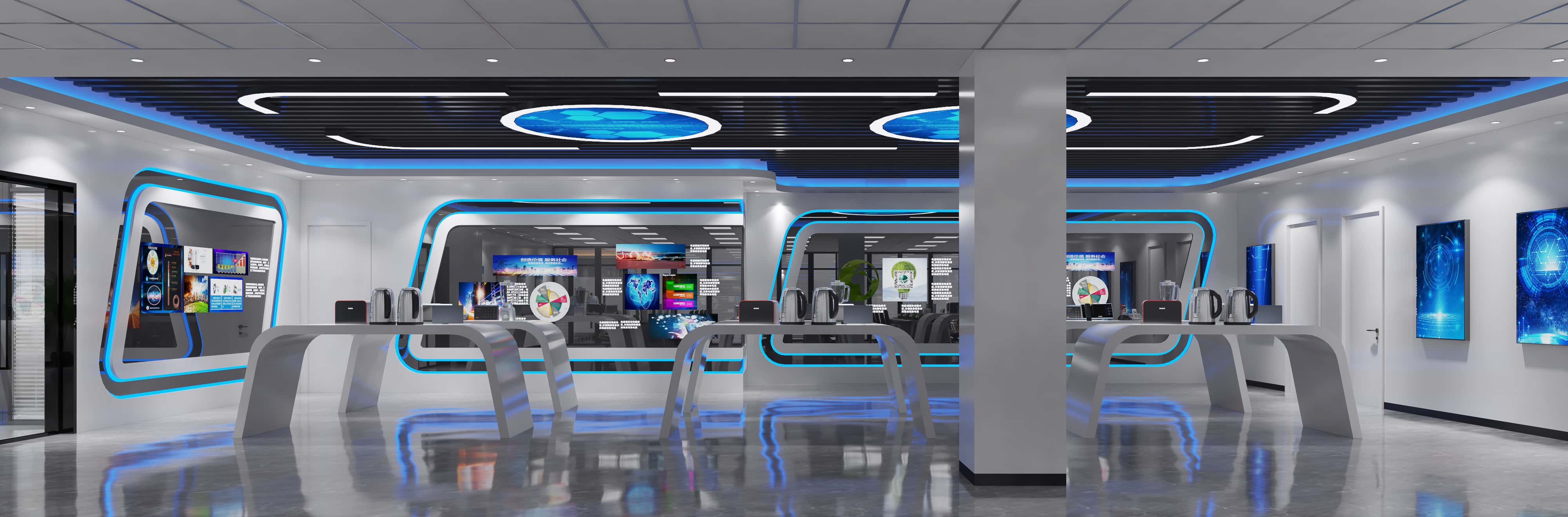 展廳,藍(lán)白為主色調(diào),造型獨(dú)特的展示墻結(jié)合多媒體設(shè)備,天花板的燈光設(shè)計(jì)與整體風(fēng)格呼應(yīng),打造出充滿科技感與未來(lái)感的展示空間,全方位展示企業(yè)形象與產(chǎn)品。