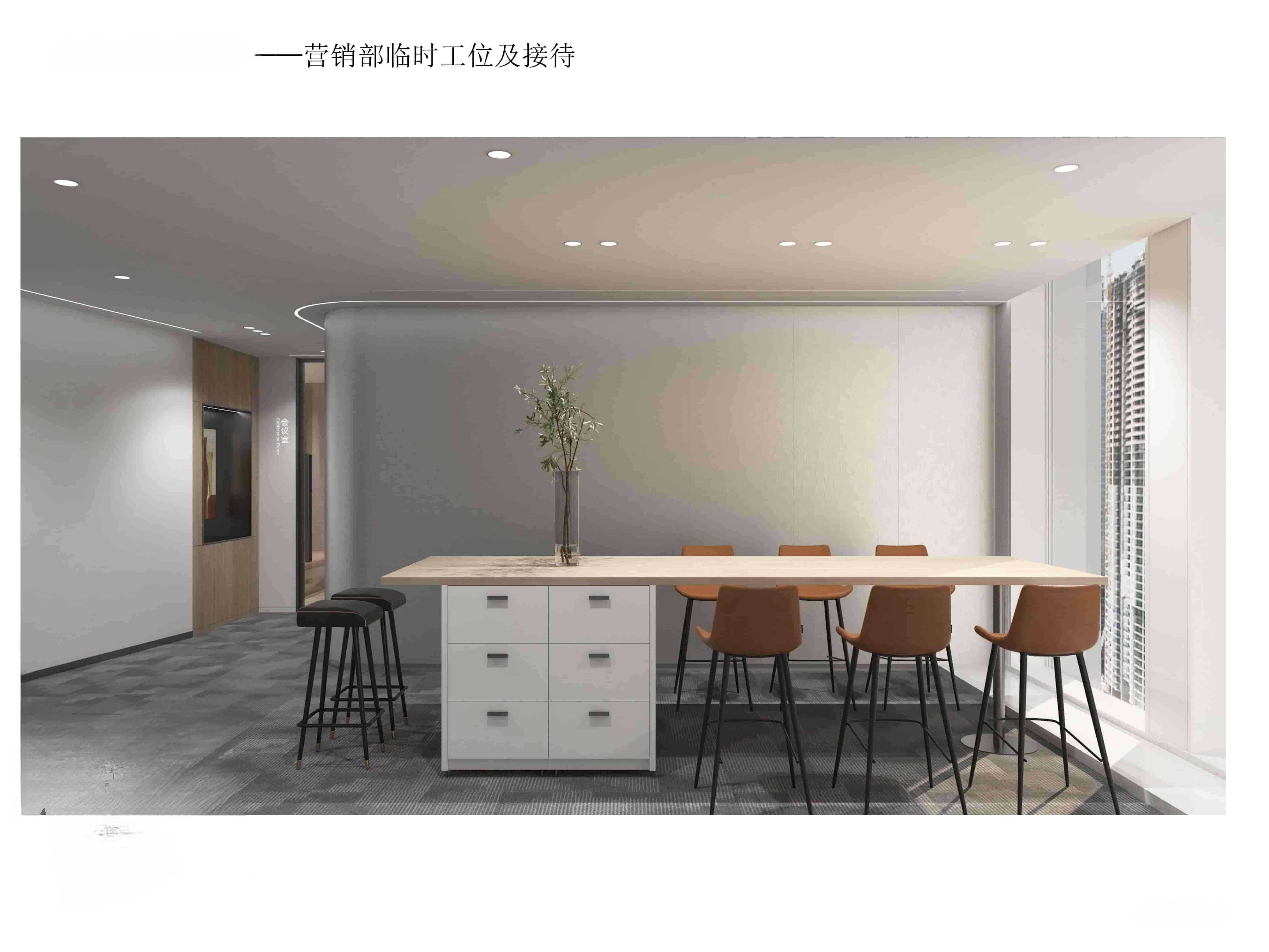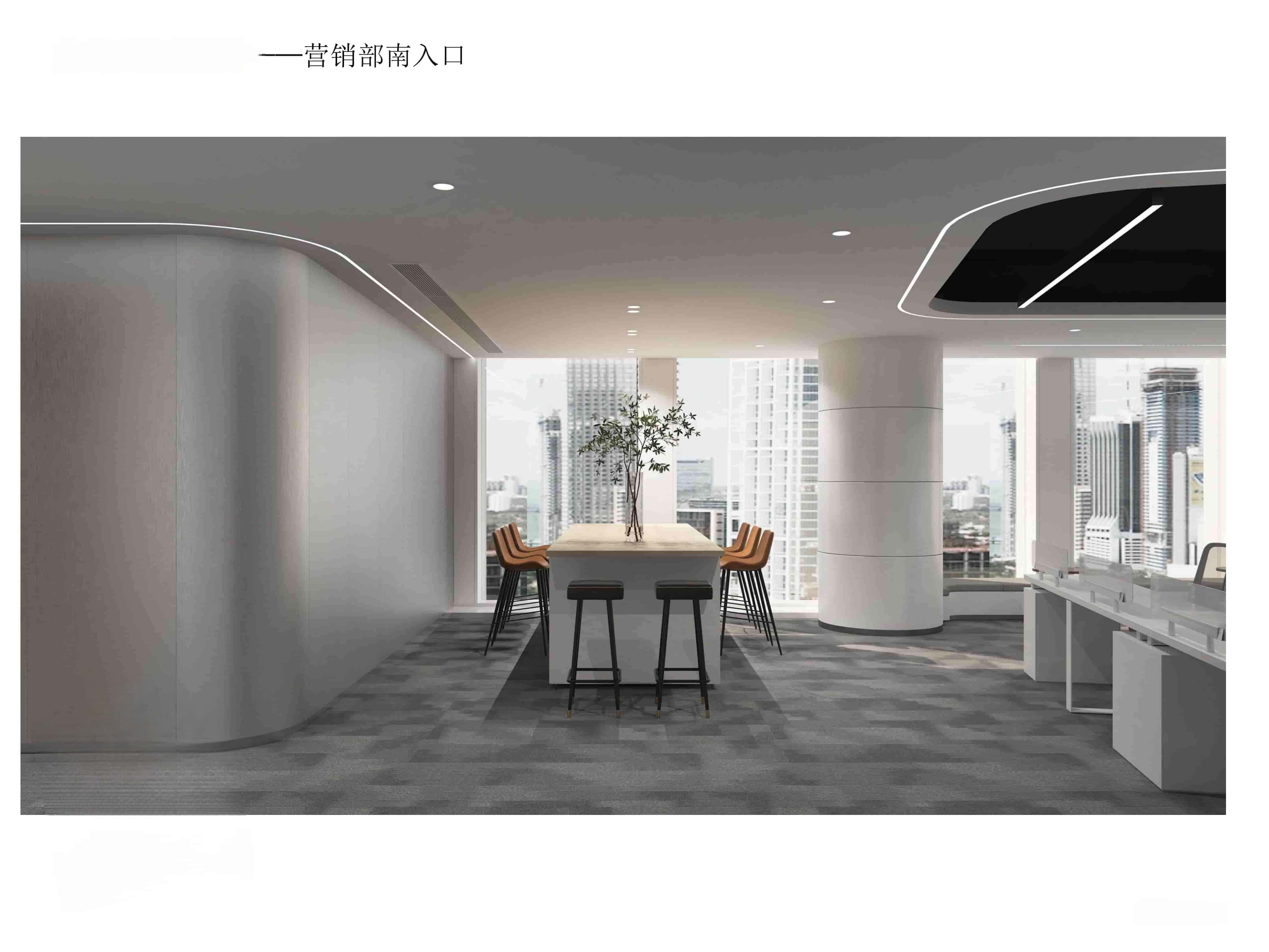 本設(shè)計為公司辦公區(qū)域,整體風(fēng)格簡約現(xiàn)代。營銷部以白色為主色調(diào),搭配灰色地毯,營造簡潔明亮氛圍。大面積辦公桌椅滿足多人辦公需求,天花板獨特的黑色區(qū)域與白色燈帶設(shè)計,增添空間層次感與科技感。南入口處設(shè)置長桌與舒適座椅,兼具臨時工位與接待功能,窗外城市景觀引入自然光線與開闊視野。臨時工位及接待區(qū)同樣簡潔實用,綠植點綴增添生機與活力。材質(zhì)選用環(huán)保耐用,燈光設(shè)計柔和明亮,旨在打造一個舒適、高效且富有活力的辦公環(huán)境,提升員工工作體驗與企業(yè)形象。