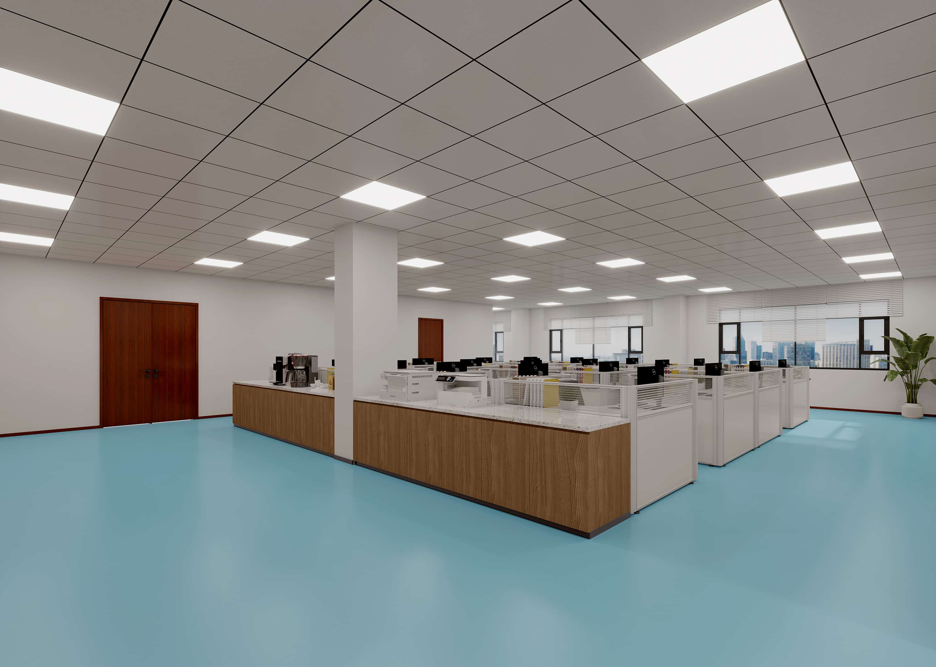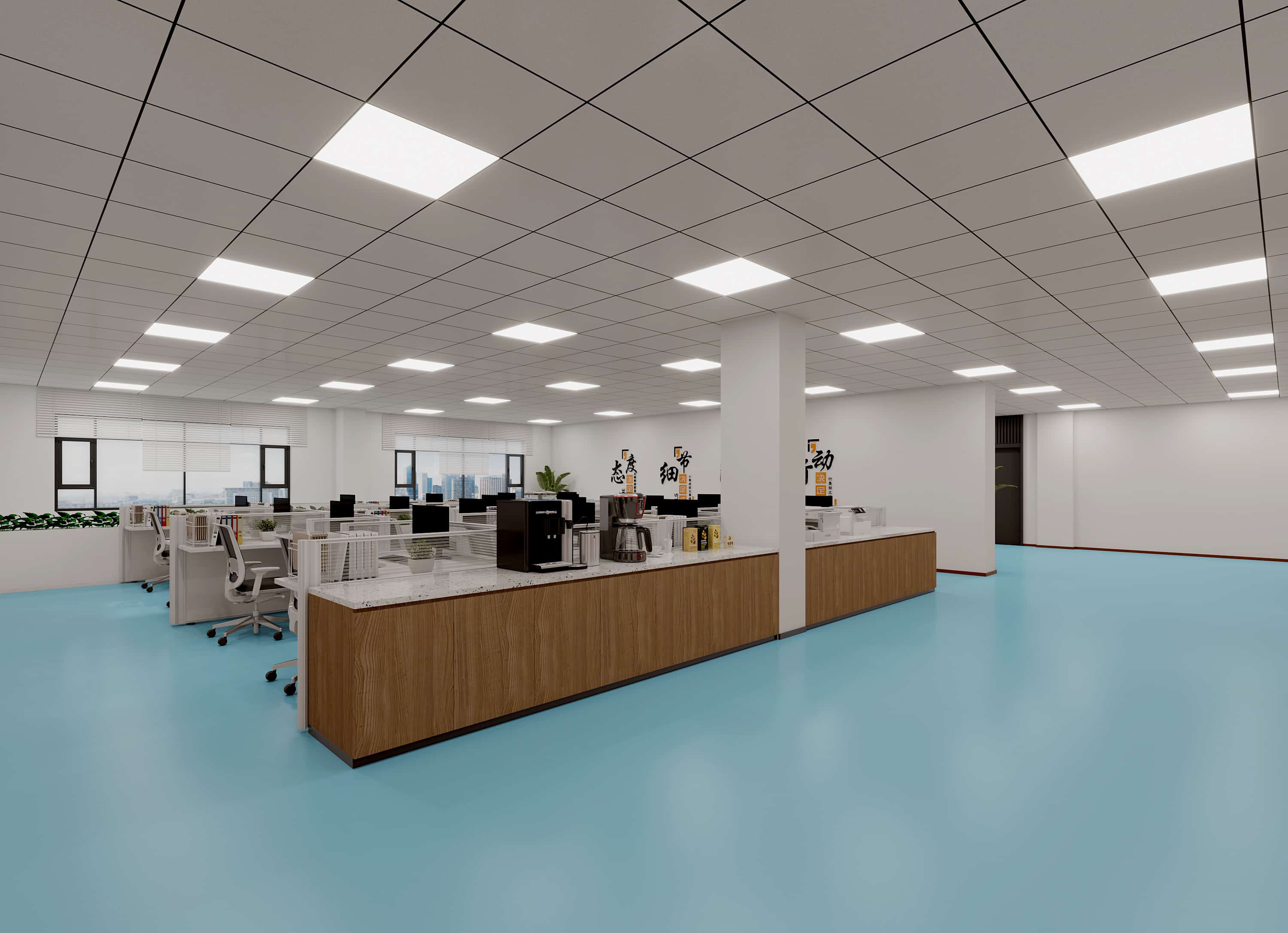 前臺區(qū)域,白色墻面搭配弧形玻璃背景墻,簡潔大氣,公司標識醒目,彰顯企業(yè)形象。地面采用淺藍色,增添空間活力。辦公區(qū),白色天花板與墻面營造明亮氛圍,木質(zhì)隔斷與辦公桌增添溫馨感,綠植點綴生機盎然。休息區(qū),棕色沙發(fā)搭配簡約茶幾,提供舒適放松空間。整體設計注重空間利用與色彩搭配,通過簡潔線條與現(xiàn)代元素,創(chuàng)造一個高效、舒適且能激發(fā)員工創(chuàng)造力的辦公環(huán)境。