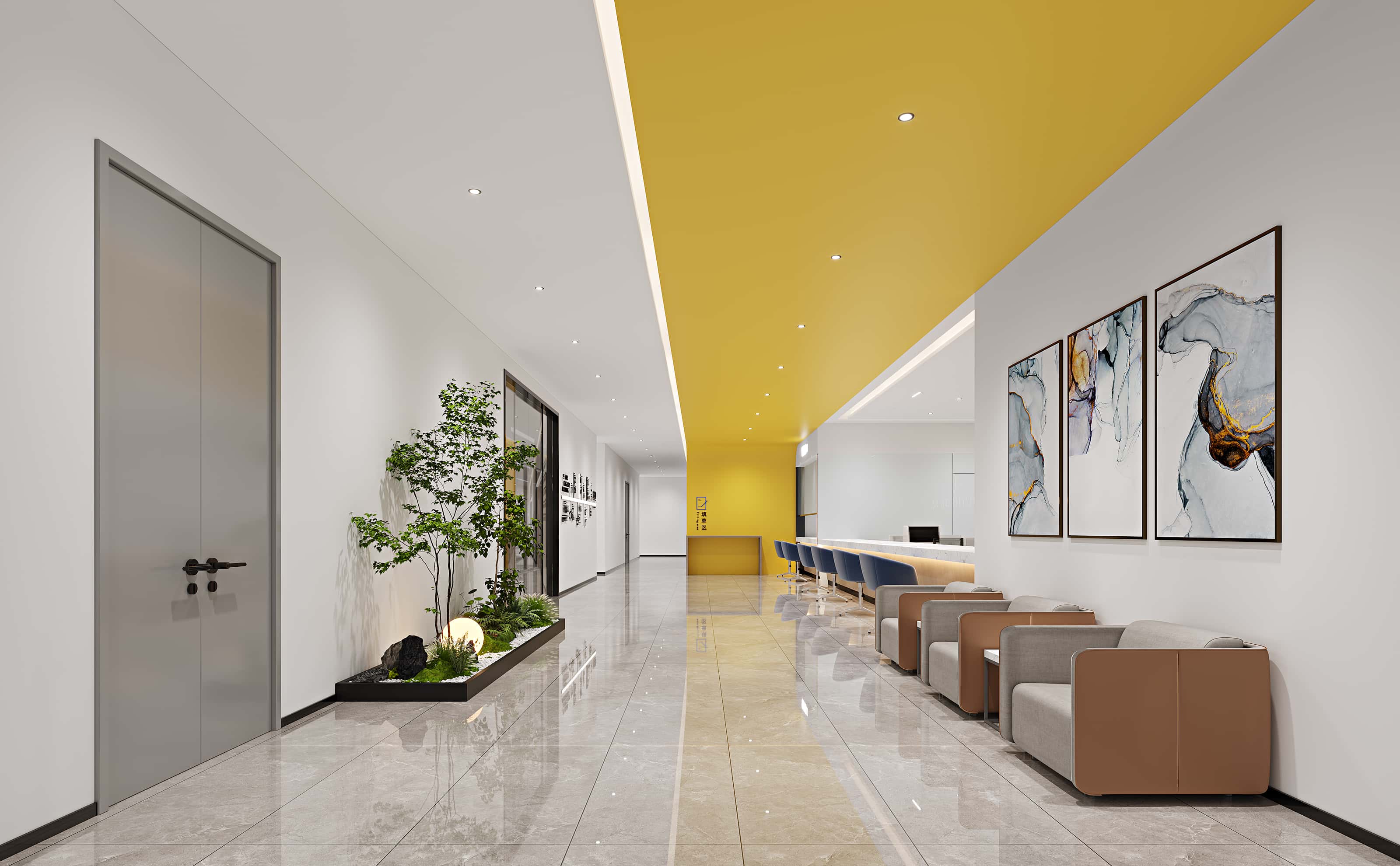 前臺(tái)區(qū)域,黃色墻面與木質(zhì)元素結(jié)合,醒目且溫馨,搭配現(xiàn)代感的接待桌椅與藝術(shù)畫作,彰顯企業(yè)形象。