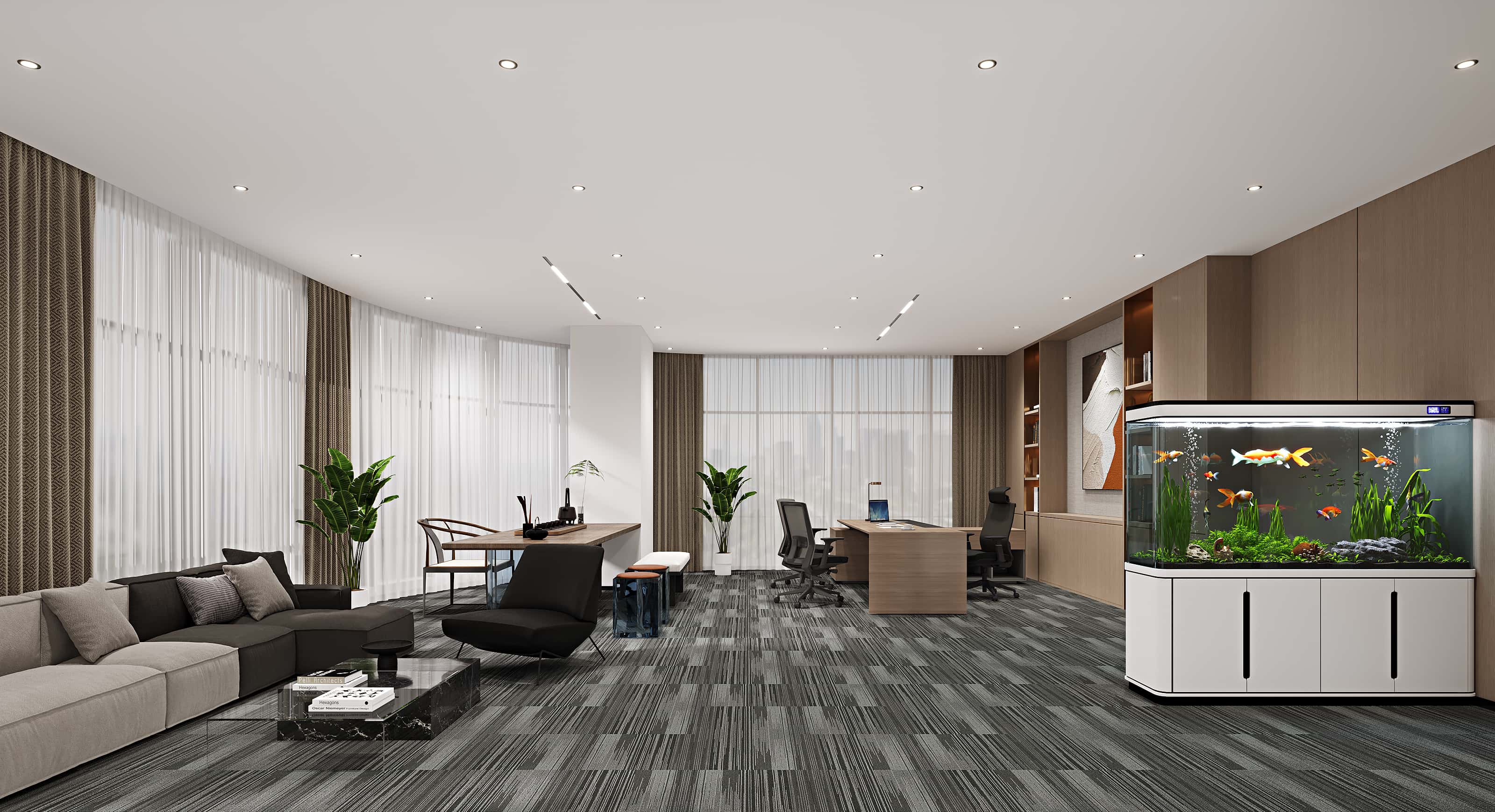 此外,還設(shè)有中式風(fēng)格的茶室,靜謐雅致,為員工提供放松交流的空間。整體設(shè)計(jì)通過色彩與功能區(qū)域的合理搭配,打造出一個(gè)舒適、高效且富有活力的辦公環(huán)境。
