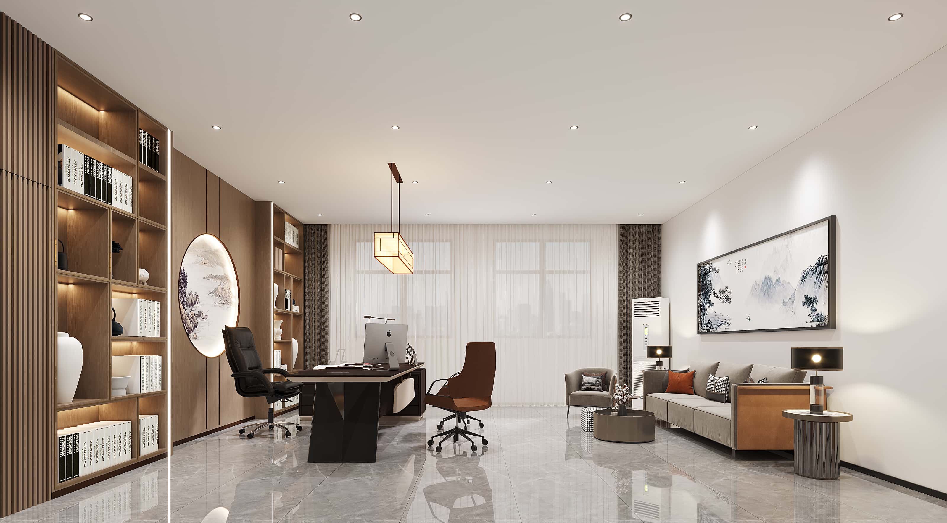 本辦公室設(shè)計融合現(xiàn)代與中式風(fēng)格,打造舒適且富有格調(diào)的辦公環(huán)境。