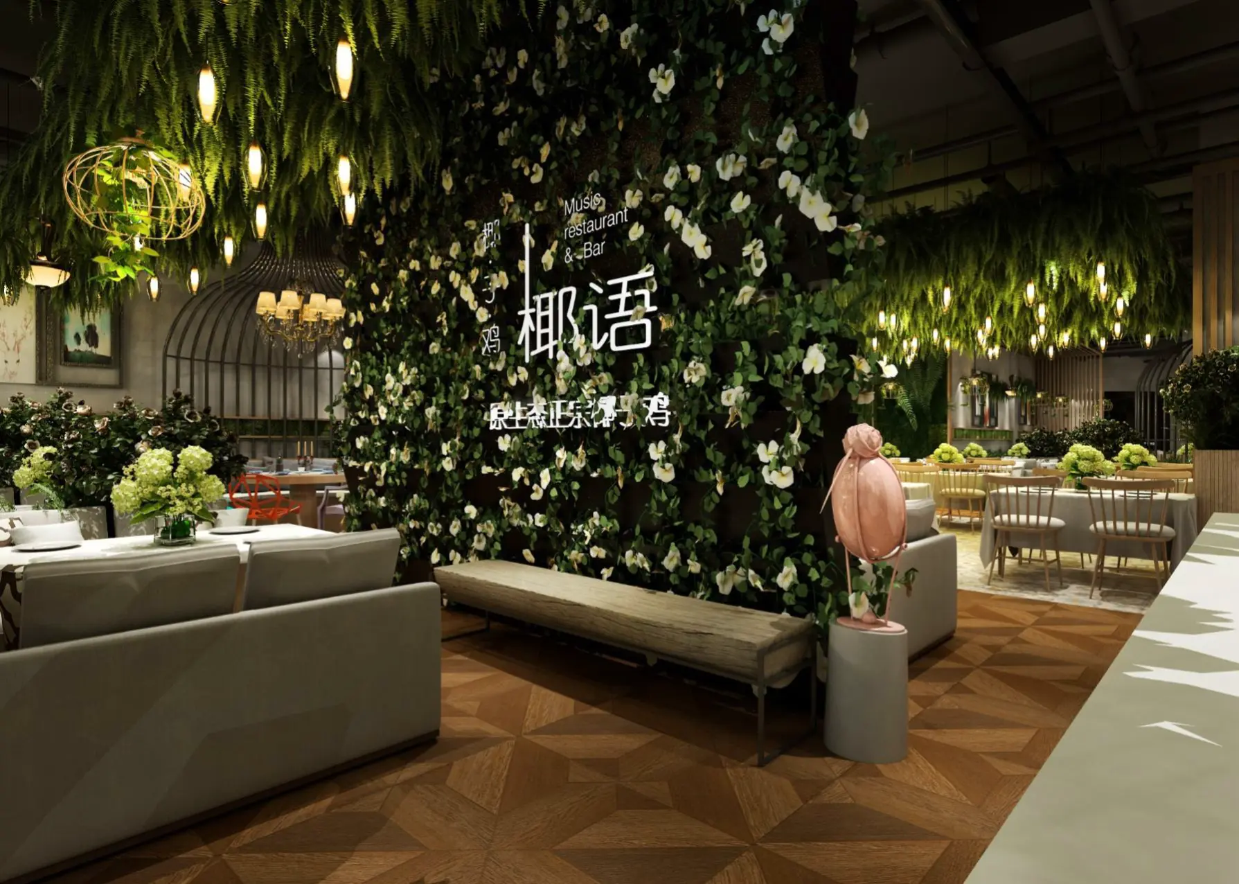 室內(nèi)空間,大面積的綠植墻搭配垂吊綠植,仿若置身熱帶雨林。地面采用木質(zhì)地板與花紋地磚拼接,增添空間層次感。桌椅以淺色系為主,搭配綠植裝飾,舒適且清新。燈光設計別具匠心,如垂吊的燈泡與鳥籠造型吊燈,柔和溫馨,與綠植相得益彰。