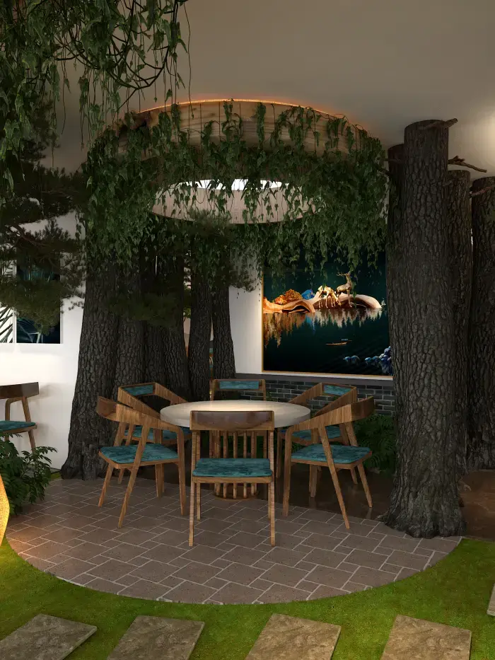 空間內(nèi)大量運(yùn)用仿真樹木、綠植與山石,營(yíng)造出濃郁的森林氛圍。地面鋪設(shè)草坪與石板路,仿佛置身林間小徑。桌椅選用木質(zhì)材質(zhì),搭配藍(lán)綠色坐墊,清新自然。墻壁上的山水畫作與植物裝飾畫,進(jìn)一步強(qiáng)化了自然主題。