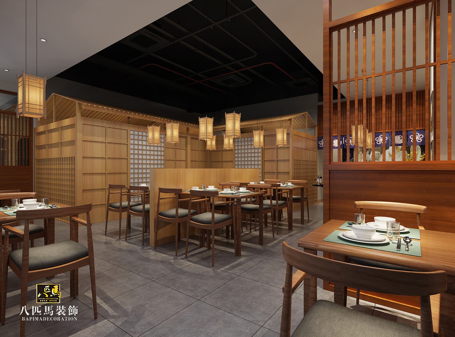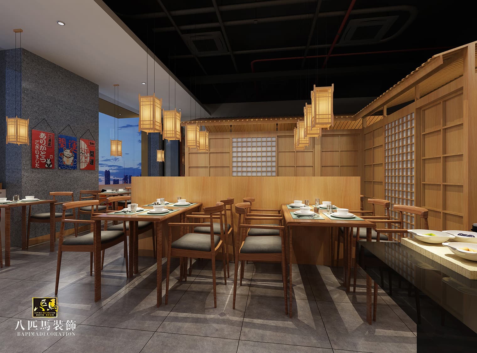 設(shè)計(jì)風(fēng)格:呈現(xiàn)的就餐氛圍清新自然、簡潔淡雅。日式料理店裝修采用清晰的線條設(shè)計(jì),木質(zhì)、石材的天然裝修材質(zhì)被運(yùn)用于區(qū)域裝修設(shè)計(jì)中,