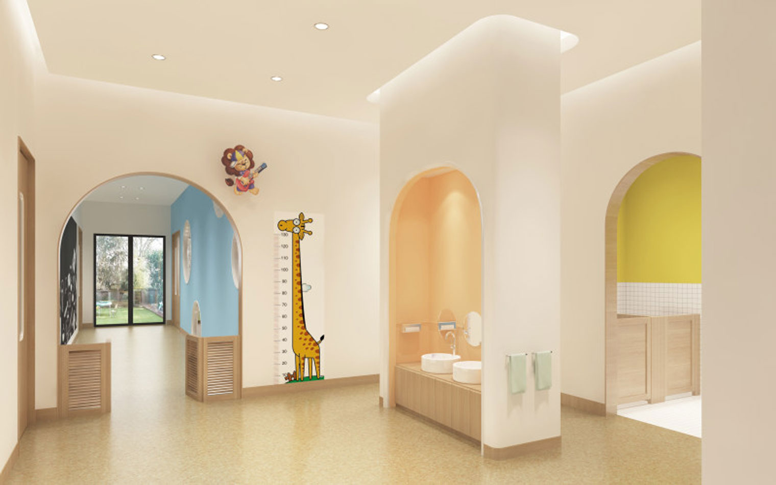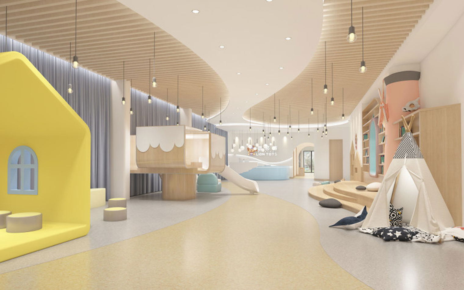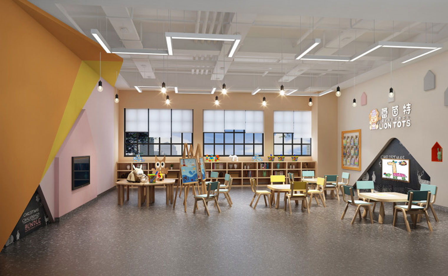本案以中心案例作為旨在開發(fā)孩童的想象力和創(chuàng)造力的地方,其室內(nèi)裝修設(shè)計不同于傳統(tǒng)美術(shù)教育空間,熱情濃烈的色彩,像一把能夠開啟幼兒全方位潛能的鑰匙,幫助每個孩子創(chuàng)造出自己的獨特。