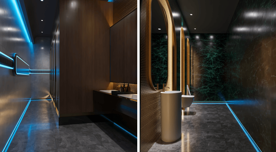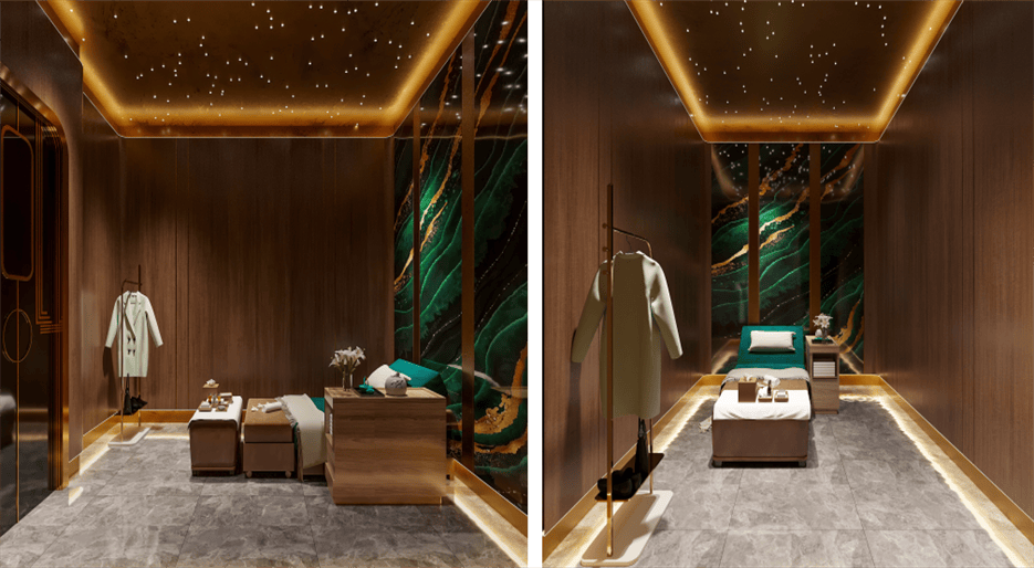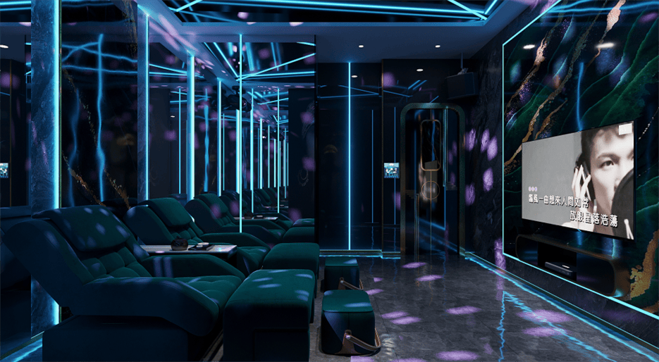 走廊及包間,深色大理石地面搭配藍(lán)色燈帶,營造出神秘且時(shí)尚的氛圍。包間內(nèi),木質(zhì)墻板搭配綠色石材背景墻,溫馨舒適,星空頂設(shè)計(jì)增添浪漫情調(diào)。KTV 包間,藍(lán)色霓虹燈帶與鏡面材質(zhì)結(jié)合,打造出炫酷的視聽空間,舒適的沙發(fā)座椅提升顧客體驗(yàn),整體設(shè)計(jì)旨在為顧客提供一個(gè)集休閑、娛樂、放松于一體的高品質(zhì)場(chǎng)所。