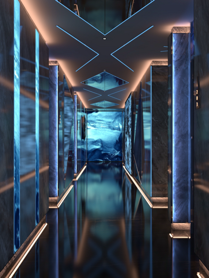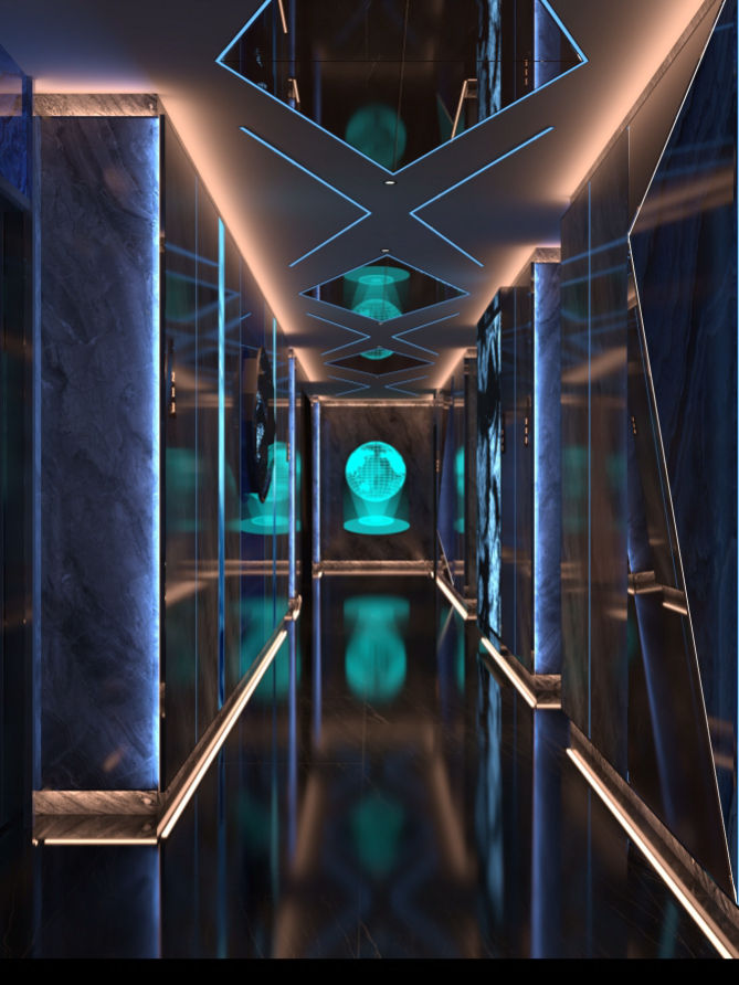 休息區(qū),墻面大型顯示屏播放動(dòng)感畫面,搭配舒適的藍(lán)色沙發(fā)與藝術(shù)雕塑,營(yíng)造出輕松愉悅的氛圍。走廊區(qū)域,深色大理石墻面結(jié)合藍(lán)色燈光線條,天花板的幾何造型燈帶與地面反射效果相呼應(yīng),增強(qiáng)空間的縱深感與科技感,墻壁上的藝術(shù)畫作和裝飾增添了文化韻味,整體設(shè)計(jì)旨在為顧客打造一個(gè)舒適、時(shí)尚且充滿活力的休閑娛樂(lè)空間。
