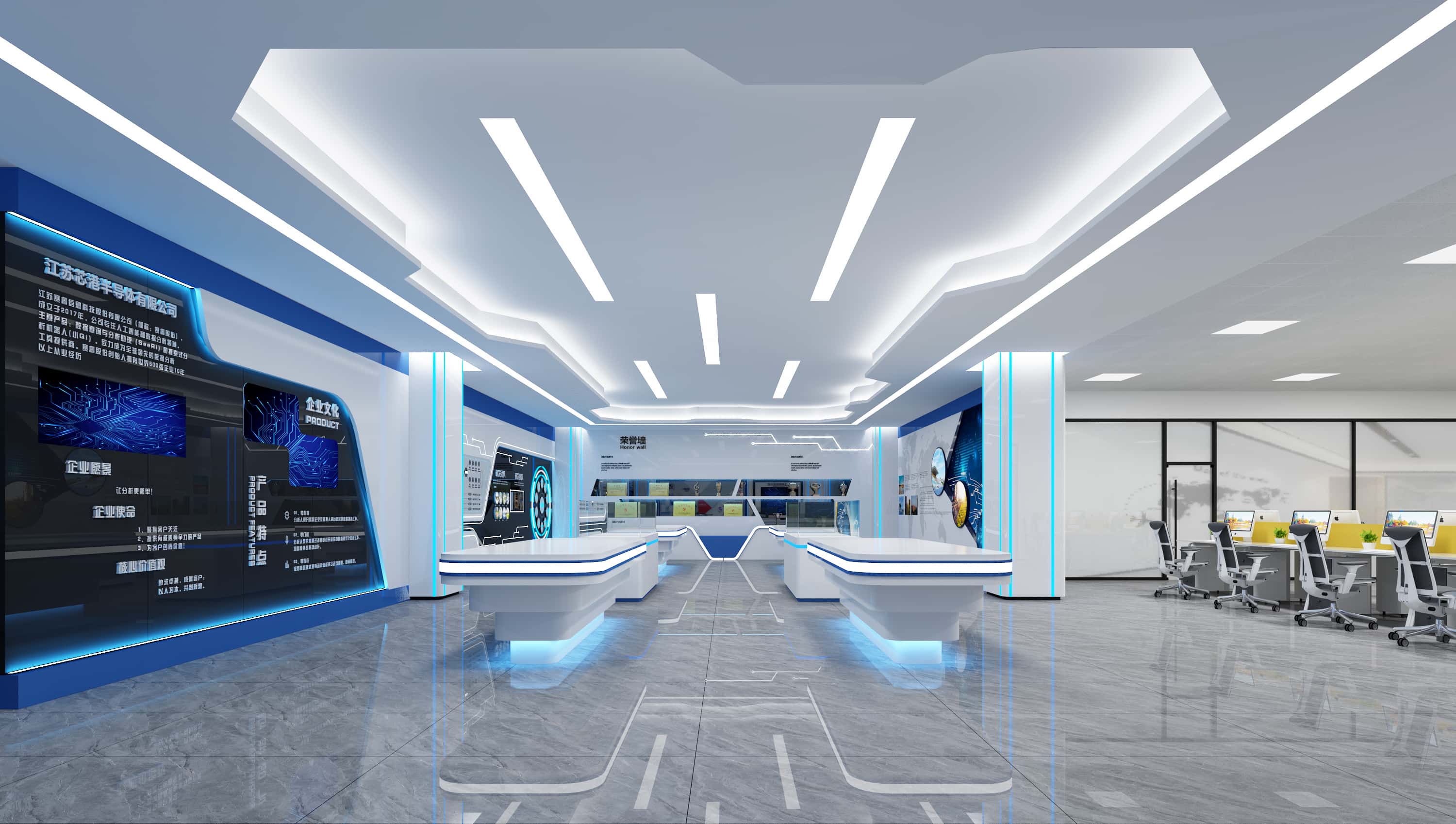 展廳區(qū)域,藍(lán)白配色凸顯科技感,墻面展板結(jié)合多媒體設(shè)備,全面展示企業(yè)信息,展示臺造型獨(dú)特,燈光設(shè)計增強(qiáng)空間立體感,打造出一個充滿科技與未來感的展示空間。