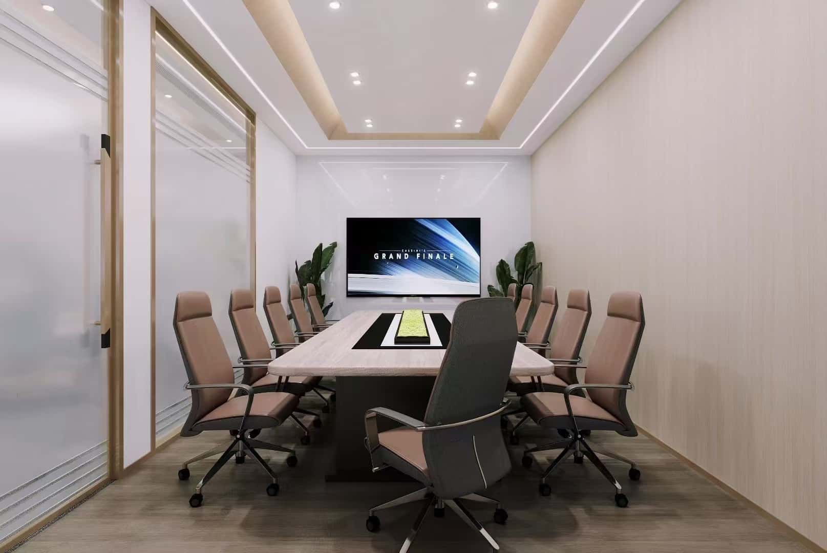 小型會議室空間緊湊而不失精致。墻面采用淺色材質,搭配木質線條裝飾,營造出溫馨舒適的氛圍。天花板的燈帶設計與墻面線條相呼應,增強了空間的整體感。會議桌選用淺色木質材質,搭配棕色皮質座椅,簡潔大方且舒適,適合小型會議或討論。墻上的大屏幕可用于展示會議內容,提升會議效率。