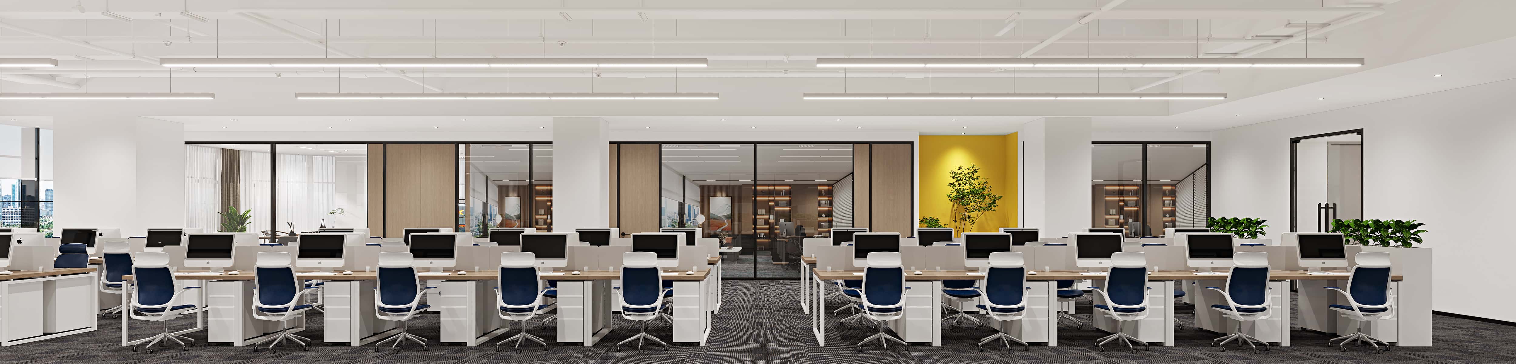 辦公區(qū),以白色為主色調(diào),簡(jiǎn)潔明亮,工位整齊排列,藍(lán)色辦公椅點(diǎn)綴其間,增添活力。頂部燈光設(shè)計(jì)合理,保證充足照明。
