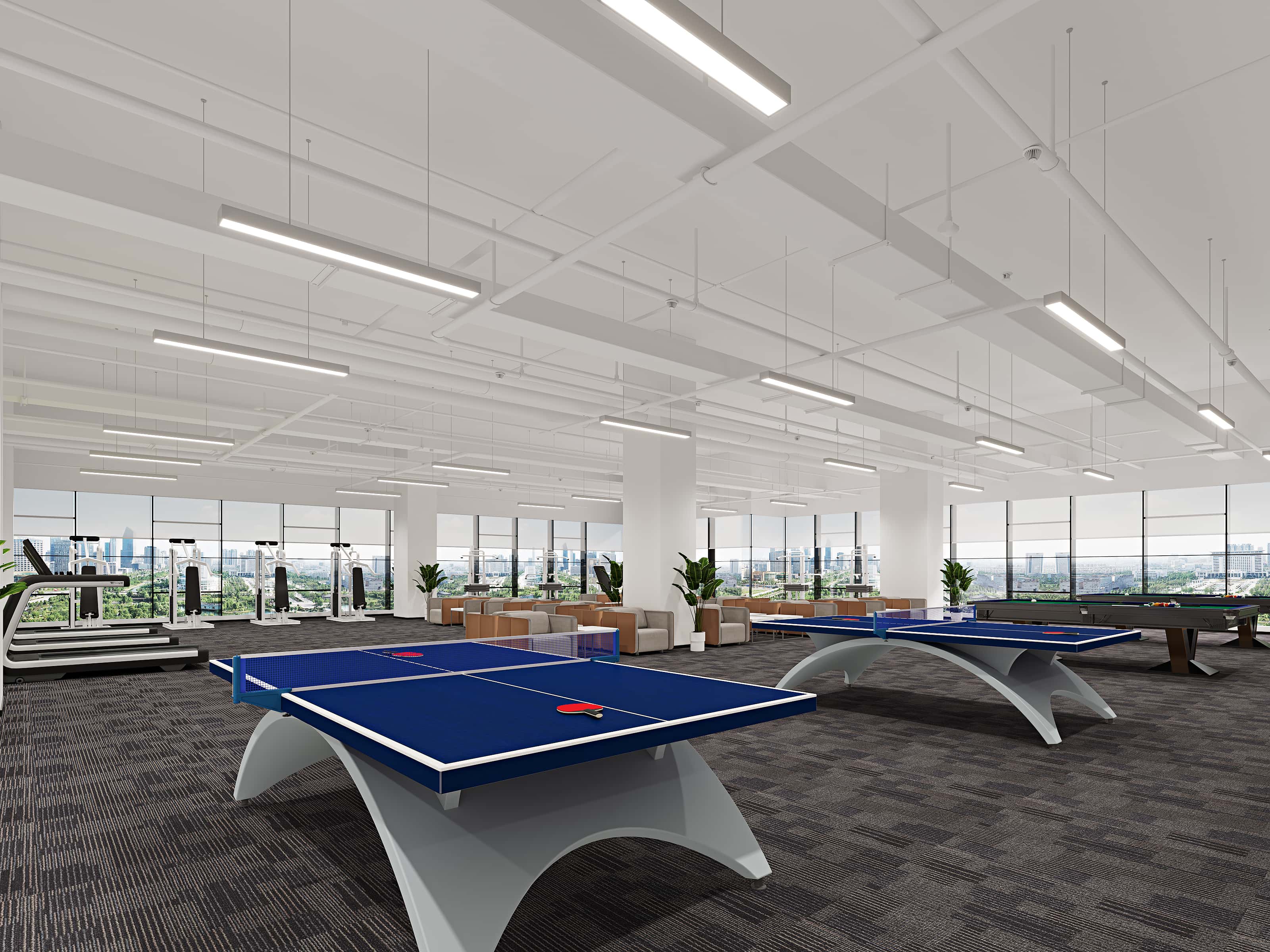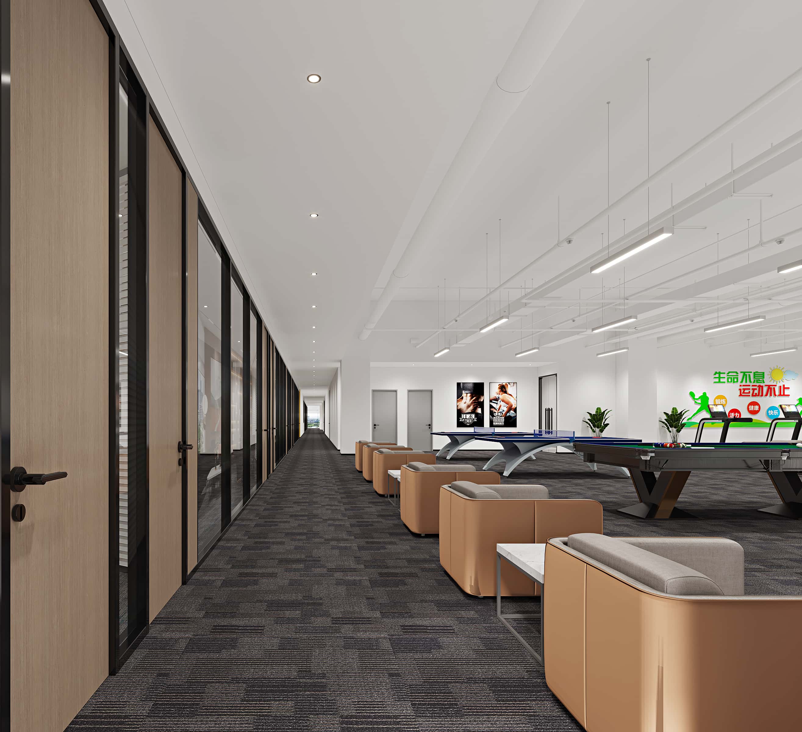 休閑區(qū),設(shè)有乒乓球桌、臺(tái)球桌等設(shè)施,搭配舒適沙發(fā),地面鋪設(shè)地毯,營造輕松氛圍,墻上 “生命不息,運(yùn)動(dòng)不止” 的標(biāo)語,鼓勵(lì)員工勞逸結(jié)合。
