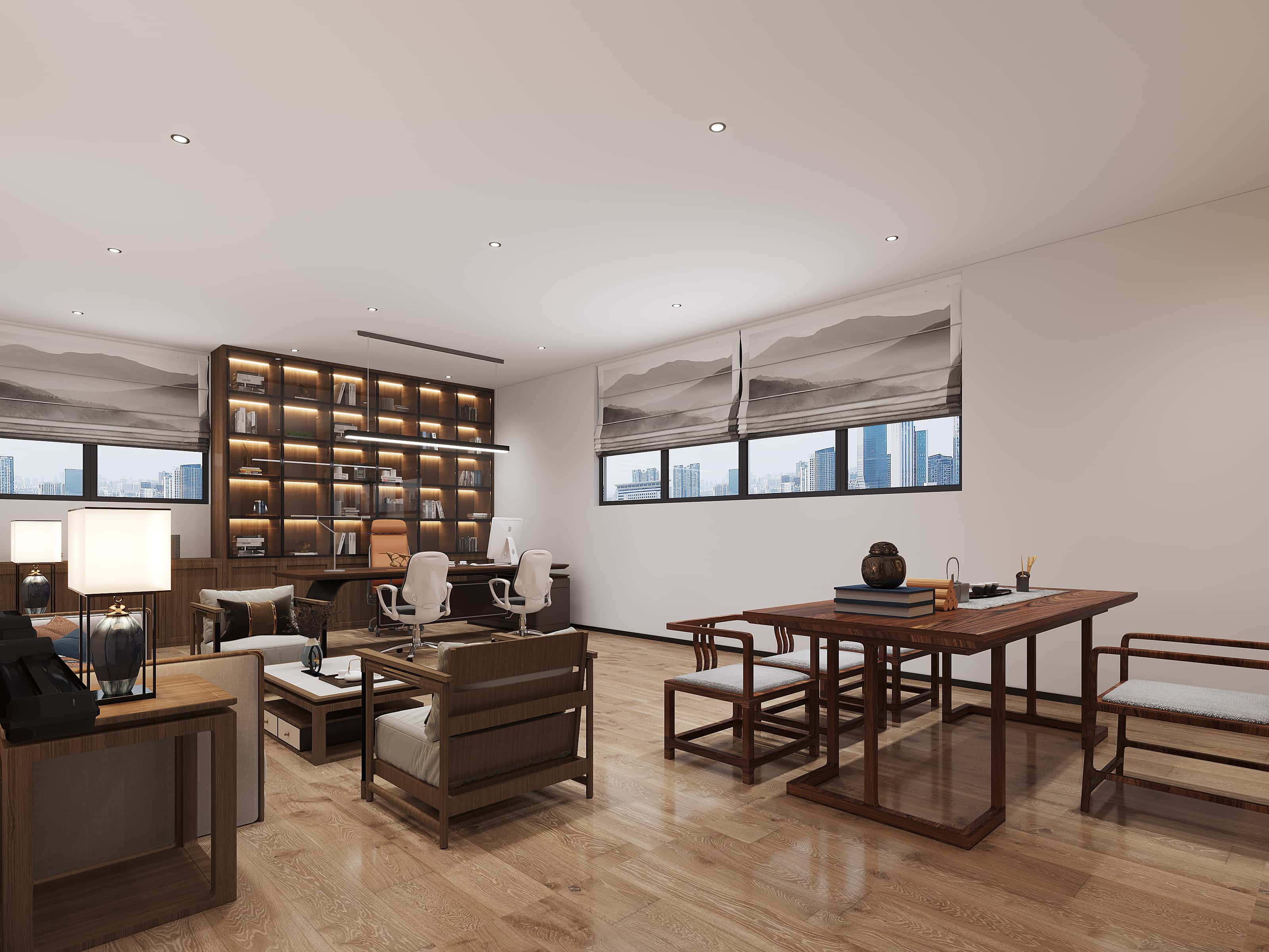 本辦公室設(shè)計融合現(xiàn)代與中式風(fēng)格,打造舒適且富有格調(diào)的辦公環(huán)境。