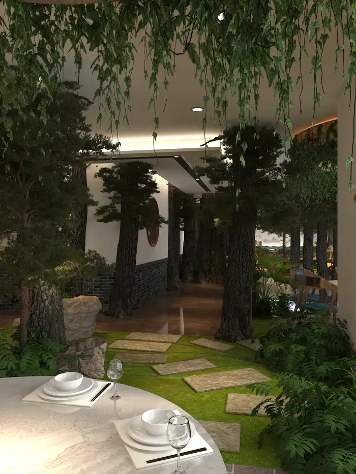 空間內(nèi)大量運(yùn)用仿真樹木、綠植與山石,營(yíng)造出濃郁的森林氛圍。地面鋪設(shè)草坪與石板路,仿佛置身林間小徑。桌椅選用木質(zhì)材質(zhì),搭配藍(lán)綠色坐墊,清新自然。墻壁上的山水畫作與植物裝飾畫,進(jìn)一步強(qiáng)化了自然主題。