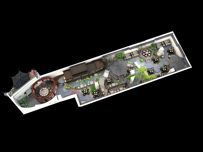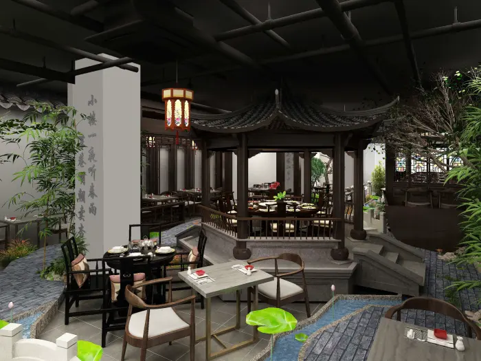 空間布局上,巧妙融入亭臺樓閣、小橋流水等元素,營造出移步換景的園林意境。青磚鋪地,搭配潺潺流水與假山綠植,仿若置身江南水鄉(xiāng)。