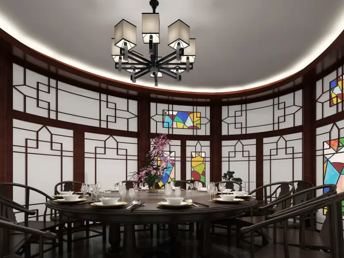 包間設(shè)計(jì)獨(dú)具匠心,圓形餐桌搭配中式吊燈,窗欞造型別致,營造出私密且舒適的用餐環(huán)境。